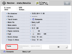 Per mettere in pausa/riavviare il processo di stampa del lavoro di copia, selezionare [Stampa]. Se si seleziona [Copia], i pulsanti necessari per questa operazione non vengono visualizzati.