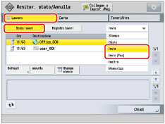 Ritrasmette il lavoro. Se si seleziona un lavoro con più destinazioni, premere [Elenco trasmis. seq.] → selezionare la destinazione alla quale ritrasmettere il lavoro → premere [Ritrasmissione].