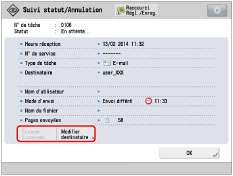 Modifica la destinazione. Se si seleziona un lavoro con più destinazioni, premere [Elenco trasmis. seq.] → selezionare la destinazione da cambiare → premere [Variazione destinazione].