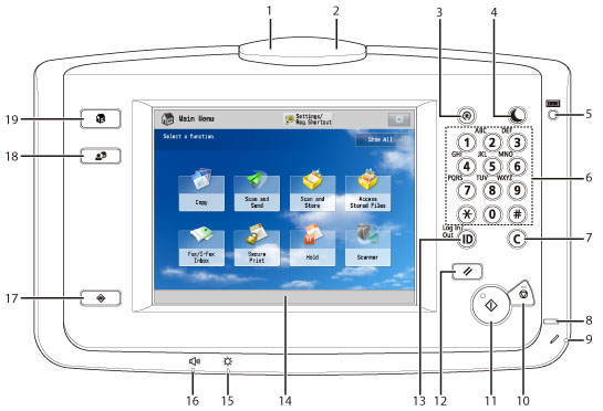 Nach Betätigen dieser Taste haben Sie Zugang zu im Expressmenü gespeicherten bevorzugten Funktionen. Wenn Sie Authentisierung verwenden, kann das für jeden einzelnen Anwender festgelegte Expressmenü angezeigt werden. (Vgl. Abschnitt "Expressmenü".)