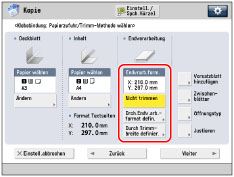 Nicht getrimmt: Länge des Endformats übersteigt die Breite der Stapelausgabe (ca. 297 mm), oder die Breite des Endformats übersteigt das entsprechende Richtungsmaß der Stapelausgabe (ca. 221 mm).