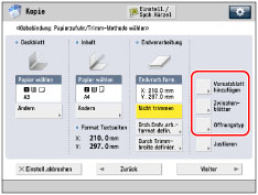Um Papier vom Zuschiesseinheit M1 zuzuführen, wählen Sie [Deckblatteinz.1] oder [Deckblatteinz.2]. Wenn das Papier vom Zuschiesseinheit M1 für den aktuellen Auftrag zugeführt wird, berühren Sie die Taste [Papier für Einzug 1 änd.] oder [Papier für Einzug 2 änd.], um das Papier für die Zwischenblätter zu wählen.