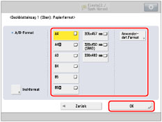 Wählen Sie als Papierformat, das Format des Papiers, das in die Zuschiesseinheit M1 eingelegt ist.