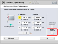 Kehren Sie zum Display <Verformung korrigieren (Parallelogramm)> zurück → Geben Sie die gemessene Länge von [g] und [a] für die Vorder- und Rückseiten ein.