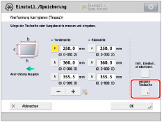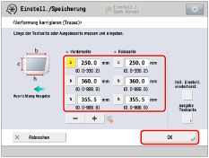 Kehren Sie zum Display <Verformung korrigieren (Trapez)> zurück → Geben Sie die gemessene Länge von [b] und [h] für die Vorder- und Rückseiten ein.