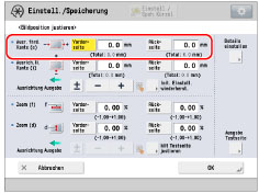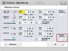 Wenn Sie das Display erneut aufrufen, nachdem Sie es durch Berühren der Taste [OK] geschlossen haben, sind die Werte im Display auf '0' zurückgesetzt. Der justierte Wert ist trotzdem weiterhin in jedem Total-Feld gültig. Wenn Sie den Schritt wiederholen, prüfen Sie die Länge von 'e' auf der neuen Testseite und geben Sie den neuen Wert ein.