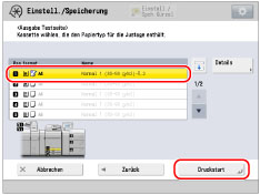 Wählen Sie ein Zufuhrmedium, das einen anwenderdefinierten Papiertyp enthält → Berühren Sie die Taste [Druckstart].