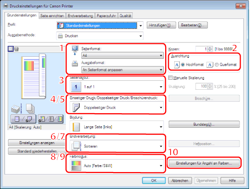 Auf der Registerkarte [Grundeinstellungen] finden Sie einige Treibergrundeinstellungen. Die Einstellungen, die Sie auf der Registerkarte [Grundeinstellungen] konfigurieren können, lassen sich auch auf anderen Registerkarten konfigurieren.