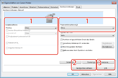 Sie können Geräteinformationen abrufen und auf der Registerkarte angezeigte Einstellungen aktualisieren (vgl. "Festlegen der Druckeroptionen").