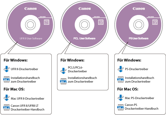 Der Druckertreiber wird von einer User Software CD-ROM installiert. Wenn es zwei oder mehrere CD-ROMs gibt, wählen Sie die richtige CD-ROM und den richtigen Druckertreiber anhand der folgenden Informationen aus.
