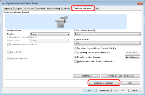Wenn Sie einen freigegebenen Drucker verwenden, müssen Sie Canon Driver Information Assist Service auf dem Druckserver installieren, damit Sie die Funktion [Gerätestatus abfragen] verwenden können. Einzelheiten zur Installation von Canon Driver Information Assist Service finden Sie im Installationshandbuch zum Druckertreiber. (vgl. "Installation").