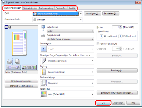 Die Standardeinstellung für [Einseitiger Druck/Doppelseitiger Druck/Broschürendruck] auf der Registerkarte [Grundeinstellungen] ist [Dopelseitiger Druck]. Nähere Informationen finden Sie unter "Einseitendruck/Doppelseitiger Druck".