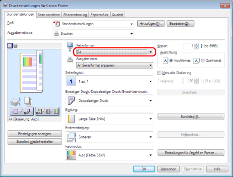 Wählen Sie das Papierformat des in der Anwendung erstellten Dokuments unter [Seitenformat].