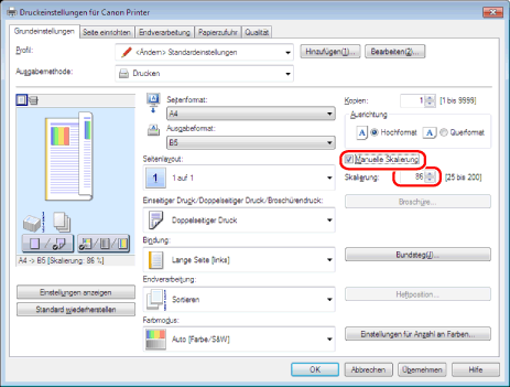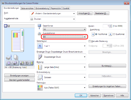 Das Dokument wird automatisch entsprechend den unter [Seitenformat] und [Ausgabeformat] festgelegten Einstellungen skaliert.