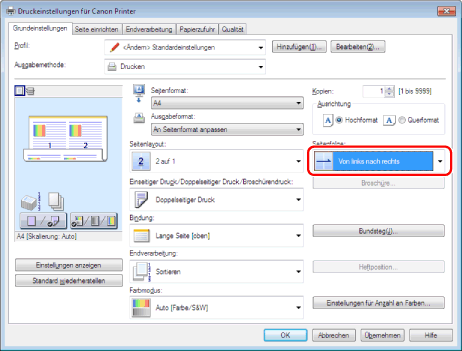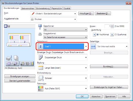 Wenn die Optionen für [Seitenlayout] nicht gewählt werden können, öffnen Sie die Registerkarte [Geräteeinstellungen] und wählen Sie [Auto] oder [Aktiviert] unter [Spoolen auf Host]. Nähere Informationen zum Anzeigen der Registerkarte [Geräteeinstellungen] finden Sie unter "Festlegen der Druckeroptionen".