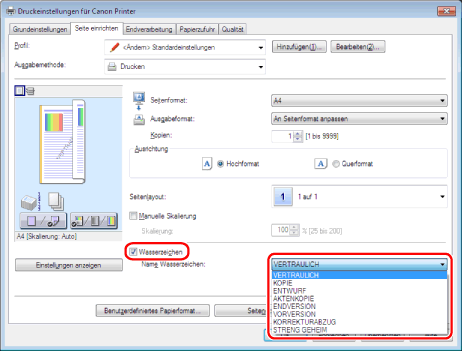 Zum Erstellen und Speichern neuer Wasserzeichen, klicken Sie auf [Wasserzeichen bearbeiten]. Nähere Informationen hierzu finden Sie in der Hilfe (vgl. "Anzeigen der Hilfe").