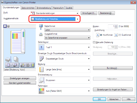 Wählen Sie unter [Ausgabemethode] die Option [Bearbeitung und Vorschau].