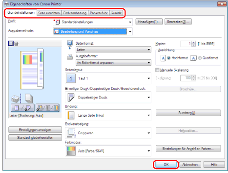 Legen Sie die gewünschten Einstellungen im Bildschirm mit den Druckereinstellungen fest → Klicken Sie auf [OK].