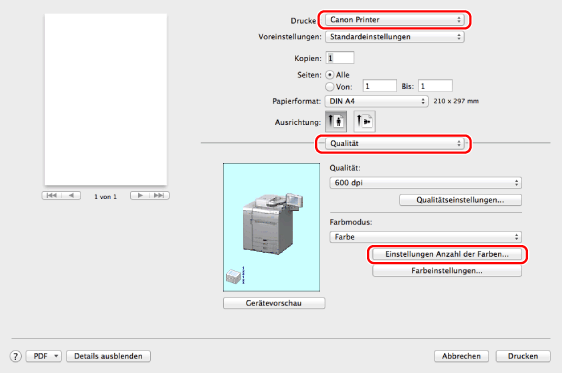 Wählen Sie den Drucker aus → Klicken Sie auf [Qualität] → Klicken Sie auf [Einstellungen Anzahl der Farben].