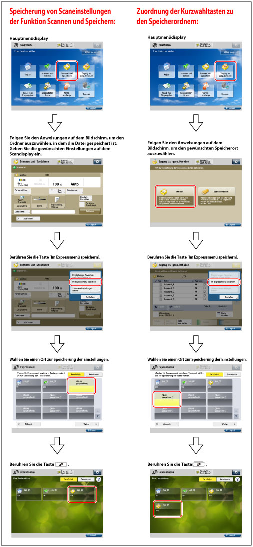 Eine Anleitung zum Speichern einer persönlichen/gemeinsamen Taste finden Sie am Beispiel der Funktion Scannen und Senden im Abschnitt "Speichern von persönlichen/gemeinsamen Tasten".