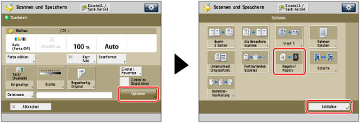 Berühren Sie nacheinander die Tasten [Optionen] → [Negativ/Positiv] → [Schließen].