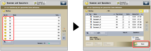 Wählen Sie die gewünschte Mailbox → Bestätigen Sie durch Berühren der Taste [Scan].