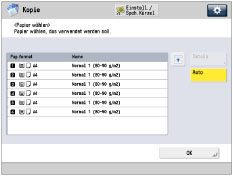 Berühren Sie nacheinander die Tasten [Präferenzen] → [Einstellungen Anzeige] → [Anzeige Bildschirm Papierliste ändern].