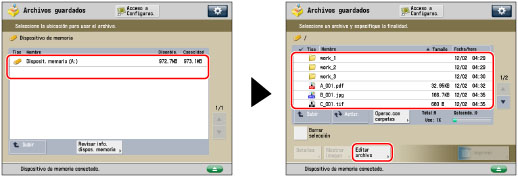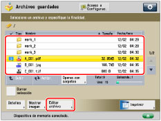 Seleccione el dispositivo de memoria que desee → seleccione el directorio donde desee guardar el archivo → pulse [Editar archivo].