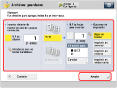 Si el papel que va a utilizar como hojas de inserción ya está impreso (por ejemplo, con el logotipo de la empresa), debe seleccionar [Dejar en blanco]. En caso contrario, el equipo imprimirá en el papel ya impreso.