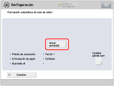 Para corregir el color utilizando el patrón de corrección guardado, pulse [Cambiar patrón corr.] → seleccione el patrón de corrección guardado → pulse [Aceptar]. Para más información sobre el patrón de corrección, consulte "Guardar patrón de corrección".
