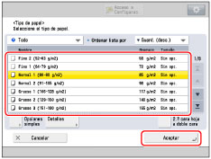 Puede guardar tipos de papel que no aparecen en la lista de opciones detalladas de la selección del tipo de papel. Para información acerca de cómo guardar un tipo de papel personalizado, consulte "Guardar tipos de papel personalizados".
