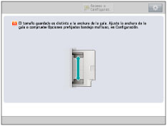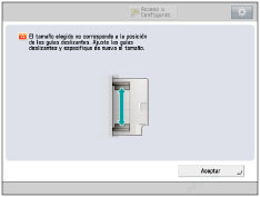 Si aparece una pantalla en la que se le pide que ajuste las guías deslizantes, ajuste el ancho de las guías deslizantes → especifique el tamaño del papel → pulse [Aceptar].