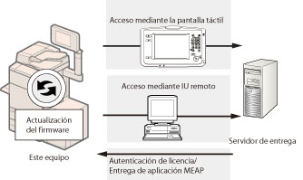 Puede actualizar el firmware del equipo a la versión más reciente con la función "Registrar/Actualizar software". Puede utilizar esta función tanto desde la pantalla táctil como desde el ordenador (IU remota).