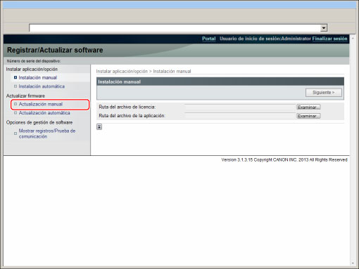 Desde la página del portal de IU remota, haga clic en [Configuración] → [Licencias/Otros] → [Registrar/Actualizar software].
