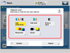 Si está desactivado [Usar Auto (Color/Blanco y negro)] en [Selec. opc. de color para copia], no se muestra [Auto (Color/B/N)]. (Consulte "Restringir el uso de la selección automática de color".)