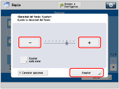 Si ajusta la densidad del fondo pulsando [Ajustar] para <Densidad del fondo>, se cancela la configuración [Auto]. De forma parecida, si pulsa [Auto] mientras hace ajustes finos en [Ajustar], se cancelan los ajustes. El equipo ajusta la densidad automáticamente para que coincida con el fondo.