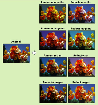 Puede realizar ajustes finos del color variando la intensidad o densidad relativa del amarillo, magenta, cian, y negro. Los ajustes de color que realice se guardan y recuperan para futuro uso.
