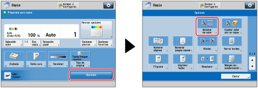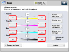 Seleccione la tecla que contenga las opciones de balance de color que desee recuperar → verifique las opciones → pulse [Aceptar].