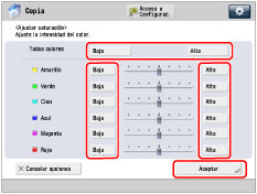 Pulse [Baja] o [Alta] para ajustar el nivel de saturación del color seleccionado o todos los colores → pulse [Aceptar].