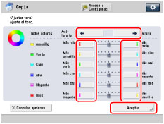 Para ajustar el nivel de tono de cada color, pulse [Más rojo], [Más verde], [Más amarillo], [Más cian], [Más azul], o [Más magenta] para cada color.