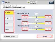 Seleccione le color que desee ajustar → pulse [-] o [+] para ajustar el nivel de densidad para oscurecer las áreas de densidad más oscura (alta), media, y más clara (baja) → pulse [Aceptar].