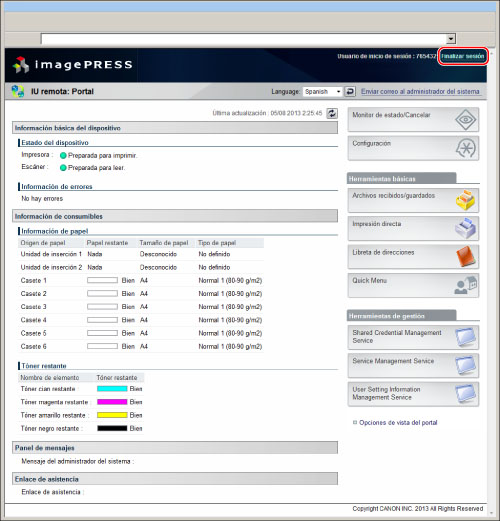 (Log In/Out) en el panel de control para cerrar la sesión.Para volver a la pantalla Menú principal, pulse