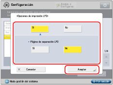 La opción de impresión de una página de presentación de trabajo se establece para cada trabajo de impresión. Incluso aunque [Sí] se haya seleccionado para <Página de separación LPD>, no es posible imprimir la página de separación para un trabajo de impresión a menos que se haya establecido una.
