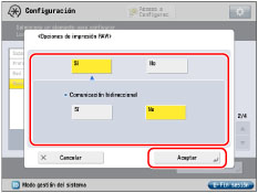 Pulse [Sí] para usar la IU remota, la impresión IPP, la impresión WSD. la lectura WSD, y la confirmación del PIN de gestión de ID de departamentos.