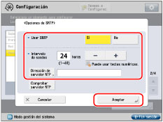 Pulse [Opciones de SNTP] para [Opciones de TCP/IP] → especifique las siguientes opciones → pulse [Aceptar].