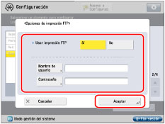 Pulse [Opciones de impresión FTP] para [Opciones de TCP/IP] → especifique las siguientes opciones → pulse [Aceptar].
