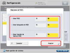 <Usar búsqueda en WSD> se establece automáticamente en 'Sí' si selecciona [Sí] para <Usar WSD> y permite obtener la información acerca del equipo mediante WSD.