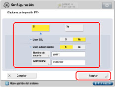 Si desea utilizar la función de autenticación IPP, pulse [Sí] para <Usar autenticación>. Pulse [Nombre de usuario] → introduzca el nombre de usuario que se utilizará para la autenticación IPP → pulse [Aceptar]. Pulse [Contraseña] → introduzca la contraseña que se utilizará para la autenticación IPP → pulse [Aceptar]. En la pantalla de confirmación, escriba la misma contraseña para confirmarla → pulse [Aceptar].