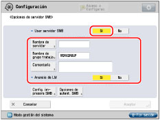 Pulse [Sí] para <Usar servidor SMB> → especifique las siguientes opciones.