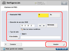 Si desea utilizar la resolución de nombres WINS, pulse [Sí] para <Resolución WINS>. Introduzca la dirección IP de un servidor WINS en [Dirección de servidor WINS].